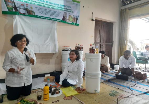 A team of UNY lecturers conducted an accompaniment programme in which 40 members of the women’s empowerment group (PKK) in Sembuhan Kidul participated. The goal of this activity was to increase the knowledge and skills of the community— especially housewives— in utilising household and garden organic waste so that it is not simply discarded, but processed into liquid organic fertilizer which can be useful for family farming as well as becoming an economically valuable product.