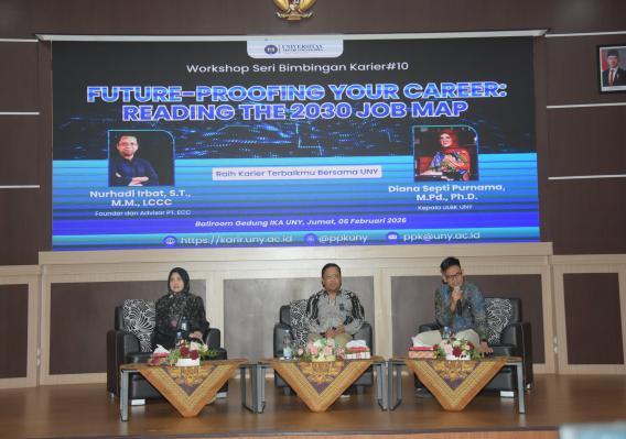 Universitas Negeri Yogyakarta (UNY) through its Directorate of Student Affairs and Alumni organized Workshop Series Career Guidance (WSBK) #10 with the theme “Future-Proofing Your Career: Reading the 2030 Job Map” on Friday, February 6, 2026, at the Ballroom, IKA UNY Alumni Building (2nd Floor). The event was attended by 1,143 participants consisting of students and alumni from all faculties and the Graduate School, with 286 participants attending in person and 857 online.